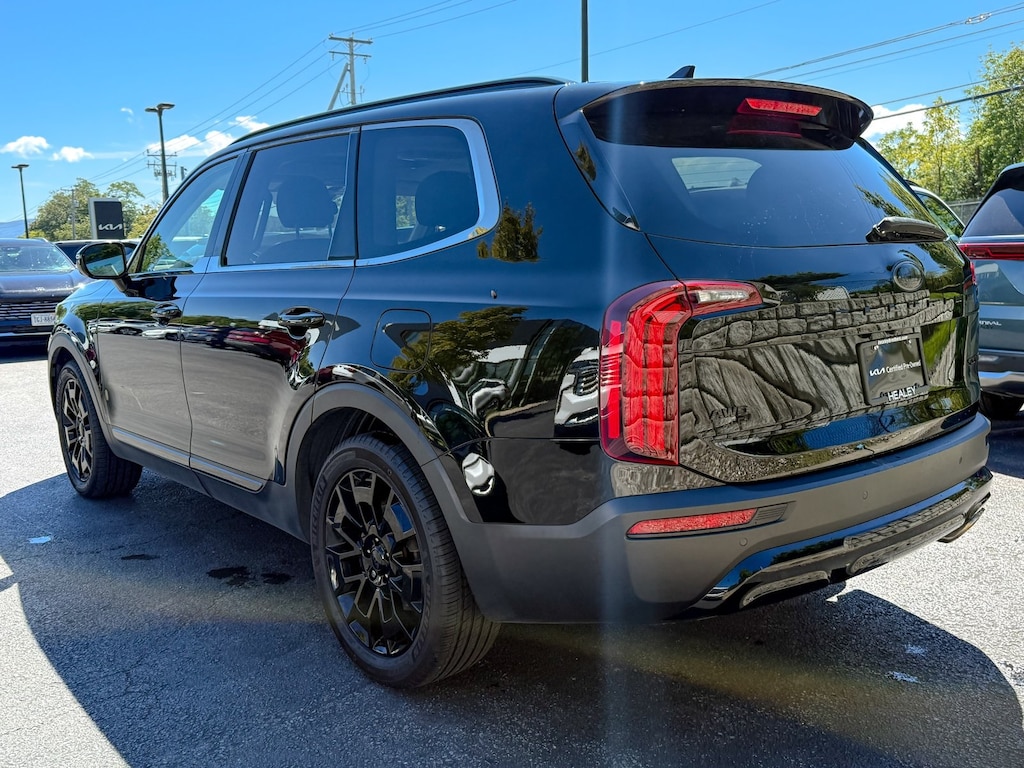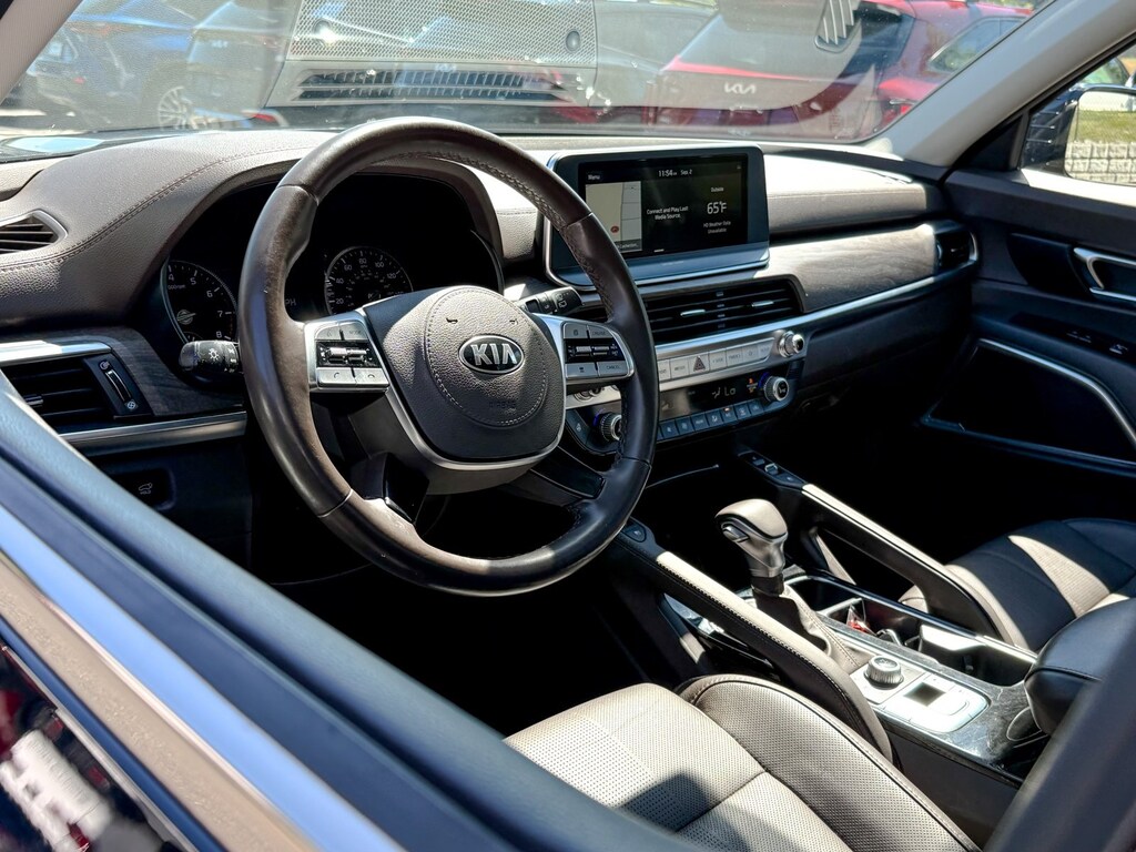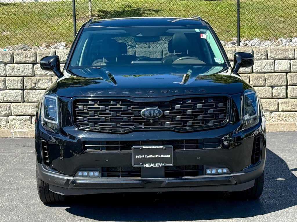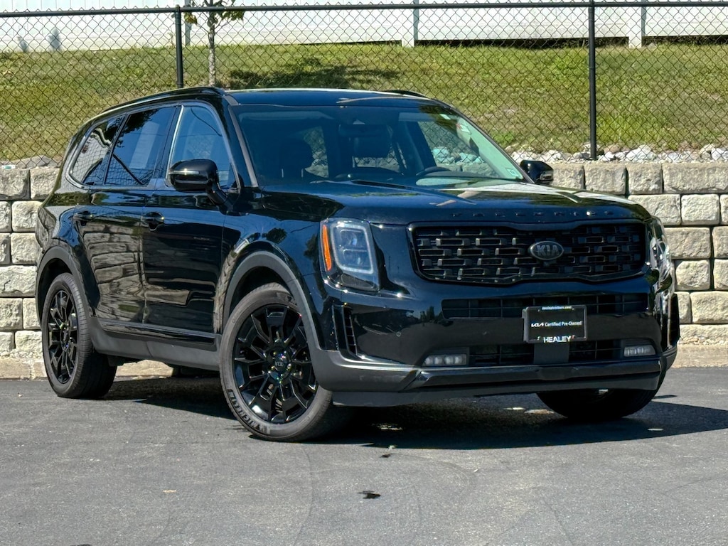 Certified. Ebony Black 2021 Kia Telluride SX 3.8L V6 DGI DOHC Dual CVVT 8-Speed Automatic AWD 10 Speakers, 3.648 Axle Ratio, 3rd row seats: split-bench, 4-Wheel Disc Brakes, ABS brakes, Air Conditioning, Alloy wheels, AM/FM radio: SiriusXM, Apple CarPlay & Android Auto, Auto High-beam Headlights, Auto-dimming Rear-View mirror, Automatic temperature control, Black Finish Radiator Grille, Body Color Exterior Door Handles, Brake assist, Bumpers: body-color, Carpeted Floor Mats, Compass, Delay-off headlights, Driver door bin, Driver vanity mirror, Dual front impact airbags, Dual front side impact airbags, Electronic Stability Control, Emergency communication system: 911 Connect, Exclusive Black Fog Light Bezel, Exclusive Black Headlight Bezels, Four wheel independent suspension, Front & Rear Gloss Black Finish Bumper Skid Plates, Front & Rear KIA Logo, Front anti-roll bar, Front Bucket Seats, Front Center Armrest, Front dual zone A/C, Front fog lights, Front reading lights, Fully automatic headlights, Garage door transmitter: HomeLink, Gloss Black Finish Exterior Emblems, Gloss Black Finish Front & Rear Door Garnish, Gloss Black Finish Roof Rails, Heated & Ventilated Front Bucket Seats, Heated door mirrors, Heated front seats, Heated steering wheel, Illuminated entry, Knee airbag, Leather Seat Trim, Leather Shift Knob, Leather steering wheel, Low tire pressure warning, Memory seat, Navigation System, Nightfall Edition Package, Occupant sensing airbag, Outside temperature display, Overhead airbag, Overhead console, Panic alarm, Passenger door bin, Passenger vanity mirror, Power door mirrors, Power driver seat, Power Liftgate, Power moonroof, Power passenger seat, Power steering, Power windows, Radio data system, Radio: AM/FM/SIRIUS Premium Audio, Rear air conditioning, Rear anti-roll bar, Rear audio controls, Rear reading lights, Rear window defroster, Rear window wiper, Reclining 3rd row seat, Remote keyless entry, Roof rack: rails only, Security system, Smart Key w/ Push Button and Remote Start, Speed control, Speed-sensing steering, Split folding rear seat, Spoiler, Steering wheel mounted audio controls, Tachometer, Telescoping steering wheel, Tilt steering wheel, Traction control, Trip computer, Turn signal indicator mirrors, Variably intermittent wipers, Ventilated front seats, Wheels: 7.5 x 20 Black Finish Alloy, Wheels: 7.5 x 20 Exclusive Black Finish Alloy.