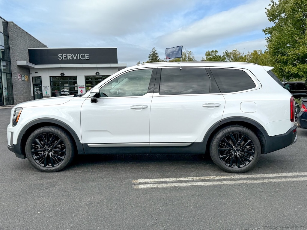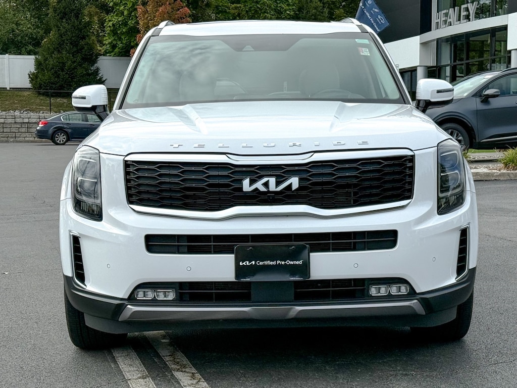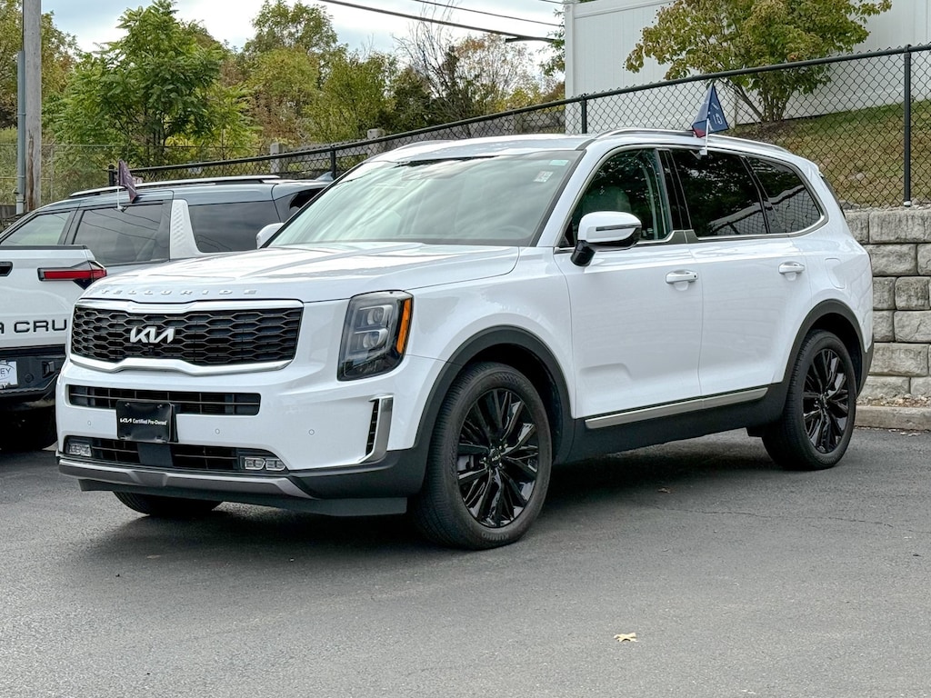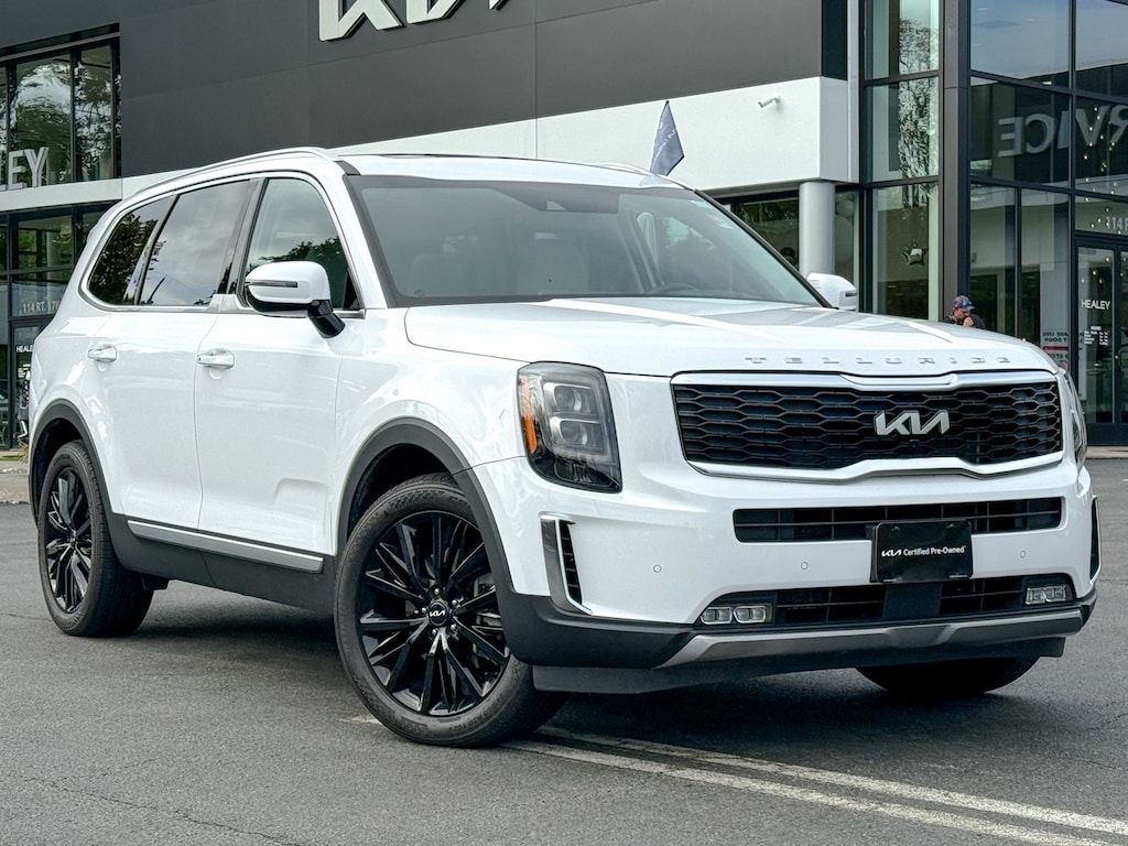 Certified. Glacial White Pearl 2022 Kia Telluride SX 3.8L V6 DOHC 8-Speed Automatic AWD 10 Speakers, 110V Inverter, 3.648 Axle Ratio, 3rd row seats: split-bench, 4-Wheel Disc Brakes, ABS brakes, Air Conditioning, Alloy wheels, AM/FM radio: SiriusXM, Apple CarPlay & Android Auto, Auto High-beam Headlights, Auto-dimming Rear-View mirror, Automatic temperature control, Brake assist, Bumpers: body-color, Carpeted Floor Mats, Compass, Delay-off headlights, Driver door bin, Driver vanity mirror, Dual front impact airbags, Dual front side impact airbags, Electronic Stability Control, Emergency communication system: 911 Connect, Four wheel independent suspension, Front anti-roll bar, Front Bucket Seats, Front Center Armrest, Front dual zone A/C, Front fog lights, Front reading lights, Fully automatic headlights, Garage door transmitter: HomeLink, harman/kardon® Speakers, Heads-Up Display, Heated & Ventilated 2nd Row Seats, Heated & Ventilated Front Bucket Seats, Heated door mirrors, Heated front seats, Heated steering wheel, Illuminated entry, Knee airbag, Leather Seat Trim, Leather Shift Knob, Leather steering wheel, Low tire pressure warning, Memory seat, Multicolored Interior Light Kit, Navigation System, Occupant sensing airbag, Outside temperature display, Overhead airbag, Overhead console, Panic alarm, Passenger door bin, Passenger vanity mirror, Power door mirrors, Power driver seat, Power Liftgate, Power moonroof, Power passenger seat, Power steering, Power windows, Premium Cloth Headliner & Pillar Trim, Premium Nappa Leather Seat Trim, Radio data system, Radio: AM/FM harman/kardon Audio System, Rain-Sensing Front Windshield Wipers, Rear air conditioning, Rear anti-roll bar, Rear audio controls, Rear reading lights, Rear window defroster, Rear window wiper, Reclining 3rd row seat, Remote keyless entry, Roof rack: rails only, Security system, Smart Key w/ Push Button and Remote Start, Speed control, Speed-sensing steering, Split folding rear seat, Spoiler, Steering wheel mounted audio controls, SX Prestige Package, Tachometer, Telescoping steering wheel, Tilt steering wheel, Traction control, Trip computer, Turn signal indicator mirrors, Variably intermittent wipers, Ventilated front seats, Wheels: 20 x 7.5 Black Alloy.