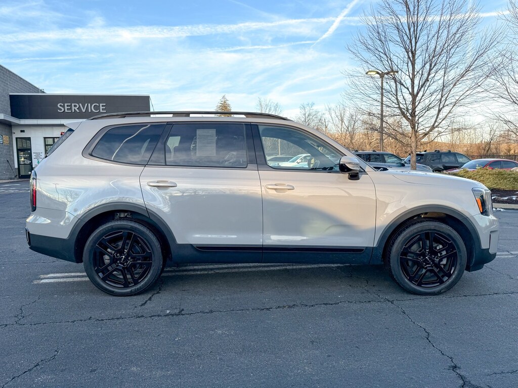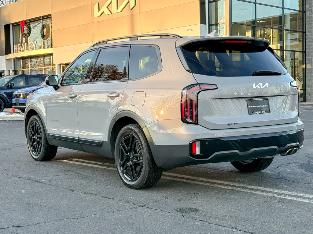 Certified. Wolf Gray 2024 Kia Telluride SX-Prestige X-Line 3.8L V6 DOHC 8-Speed Automatic AWD 10 Speakers, 3.648 Axle Ratio, 3rd row seats: split-bench, 4-Wheel Disc Brakes, ABS brakes, Air Conditioning, Alloy wheels, AM/FM radio: SiriusXM, Apple CarPlay & Android Auto, Auto High-beam Headlights, Auto-dimming Rear-View mirror, Auto-leveling suspension, Automatic temperature control, Brake assist, Bumpers: body-color, Carpet Floor Mats, Compass, Delay-off headlights, Driver door bin, Driver vanity mirror, Dual front impact airbags, Dual front side impact airbags, Electronic Stability Control, Emergency communication system: 911 Connect, Exterior Parking Camera Rear, Four wheel independent suspension, Front anti-roll bar, Front Bucket Seats, Front Center Armrest, Front dual zone A/C, Front fog lights, Front reading lights, Fully automatic headlights, Garage door transmitter: HomeLink, harman/kardon® Speakers, Heads-Up Display, Heated & Ventilated Front Bucket Seats, Heated door mirrors, Heated front seats, Heated rear seats, Heated steering wheel, Hybrid Cargo Net, Illuminated entry, Knee airbag, Leather Shift Knob, Leather steering wheel, Low tire pressure warning, Memory seat, Navigation System, Occupant sensing airbag, Outside temperature display, Overhead airbag, Overhead console, Panic alarm, Passenger door bin, Passenger vanity mirror, Power door mirrors, Power driver seat, Power Liftgate, Power moonroof, Power passenger seat, Power steering, Power windows, Premium Nappa Leather Seat Trim, Radio data system, Radio: AM/FM Harman Kardon Audio System, Rain sensing wipers, Rear air conditioning, Rear anti-roll bar, Rear audio controls, Rear reading lights, Rear side impact airbag, Rear window defroster, Rear window wiper, Reclining 3rd row seat, Remote keyless entry, Roof rack: rails only, Security system, Smart Key w/ Push Button and Remote Start, Speed control, Speed-sensing steering, Split folding rear seat, Spoiler, Steering wheel mounted audio controls, Tachometer, Telescoping steering wheel, Terracotta Interior Color Package, Tilt steering wheel, Traction control, Trip computer, Turn signal indicator mirrors, Variably intermittent wipers, Ventilated front seats, Ventilated rear seats, Wheels: 20 x 7.5 Black Finish X-LINE Exclusive.