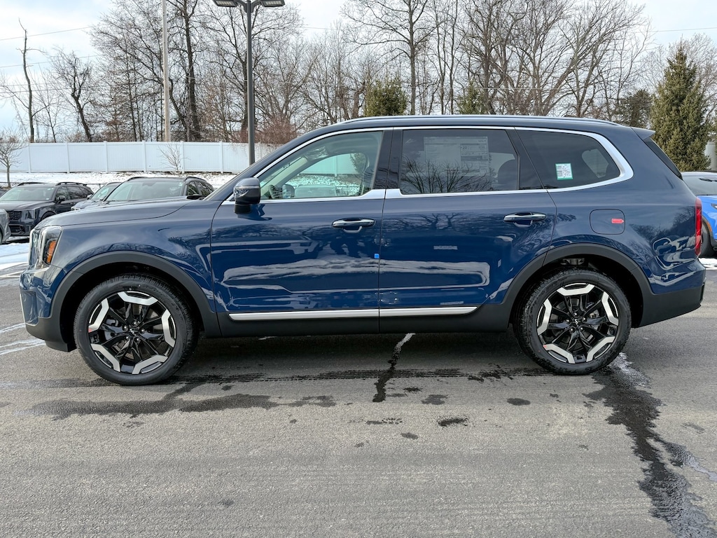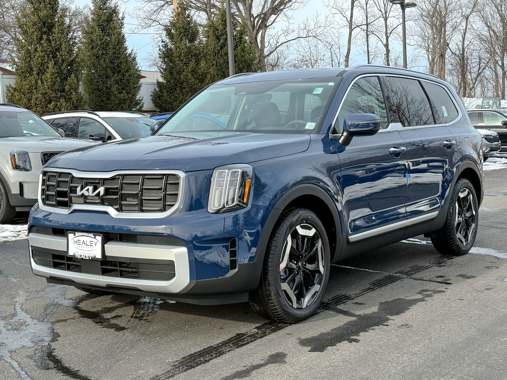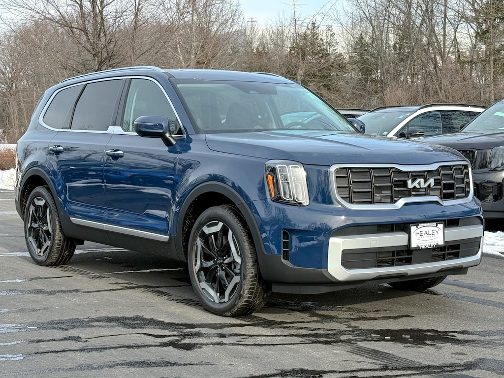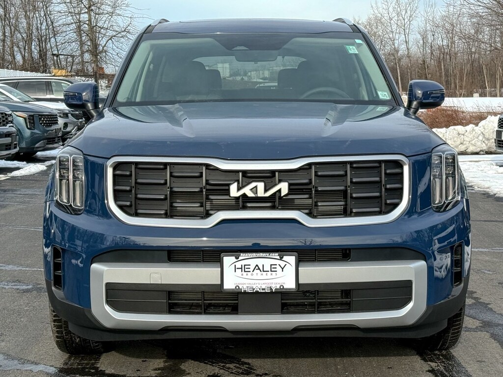 Midnight Lake Blue 2025 Kia Telluride S AWD 8-Speed Automatic 3.8L V6 DOHC 3rd row seats: split-bench, 4-Wheel Disc Brakes, 6 Speakers, ABS brakes, Air Conditioning, Alloy wheels, AM/FM radio: SiriusXM, Apple CarPlay & Android Auto, Auto High-beam Headlights, Automatic temperature control, Brake assist, Bumpers: body-color, Carpeted Floor Mats, Delay-off headlights, Driver door bin, Driver vanity mirror, Dual front impact airbags, Dual front side impact airbags, Electronic Stability Control, Emergency communication system: 911 Connect, Exterior Parking Camera Rear, Four wheel independent suspension, Front anti-roll bar, Front Bucket Seats, Front Center Armrest, Front dual zone A/C, Front reading lights, Fully automatic headlights, Heated door mirrors, Heated Front Bucket Seats, Heated front seats, Hybrid Cargo Net, Illuminated entry, Knee airbag, Leather Shift Knob, Leather steering wheel, Low tire pressure warning, Navigation System, Occupant sensing airbag, Outside temperature display, Overhead airbag, Overhead console, Panic alarm, Passenger door bin, Passenger vanity mirror, Power door mirrors, Power driver seat, Power Liftgate, Power moonroof, Power steering, Power windows, Radio data system, Radio: AM/FM Display Audio System, Rear air conditioning, Rear anti-roll bar, Rear audio controls, Rear reading lights, Rear side impact airbag, Rear window defroster, Rear window wiper, Reclining 3rd row seat, Remote keyless entry, Security system, Speed control, Speed-sensing steering, Split folding rear seat, Spoiler, Steering wheel mounted audio controls, SynTex Synthetic Leather Seat Trim, Tachometer, Telescoping steering wheel, Tilt steering wheel, Traction control, Trip computer, Turn signal indicator mirrors, Variably intermittent wipers, Wheels: 20 x 7.5 Black Finish.