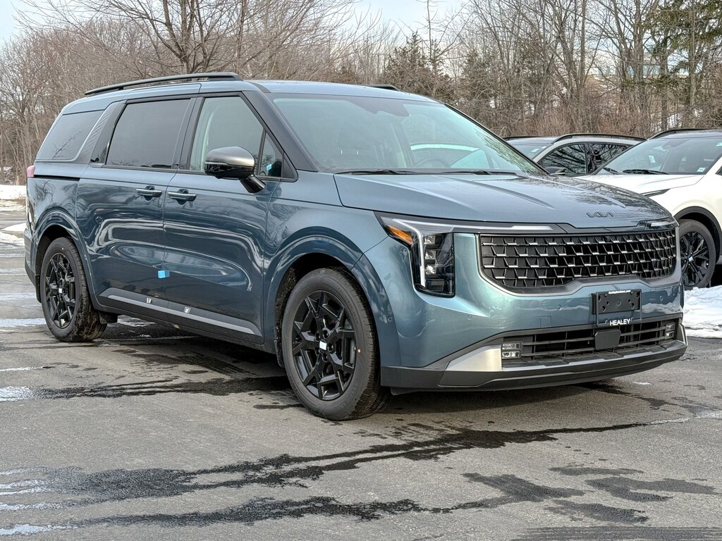 Astra Blue 2026 Kia Carnival SX FWD 8-Speed Automatic V6 3.51 Axle Ratio, 3rd row seats: split-bench, 4-Wheel Disc Brakes, 8 Speakers, ABS brakes, Air Conditioning, Alloy wheels, AM/FM radio: SiriusXM, Apple CarPlay & Android Auto, Artificial Leather Seat Trim, Auto High-beam Headlights, Automatic temperature control, Brake assist, Bumpers: body-color, Cargo Mat, Carpeted Floor Mats (8-Passenger), Compass, Dark Edition Front Grille Trim, Dark Edition Mirror Caps, Delay-off headlights, Driver door bin, Driver vanity mirror, Dual front impact airbags, Dual front side impact airbags, Electronic Stability Control, Emergency communication system, Exterior Parking Camera Rear, Four wheel independent suspension, Front anti-roll bar, Front Bucket Seats, Front Center Armrest, Front dual zone A/C, Front fog lights, Front reading lights, Fully automatic headlights, Heated & Ventilated Front Bucket Seats, Heated door mirrors, Heated front seats, Illuminated entry, Knee airbag, Leather Shift Knob, Leather steering wheel, Low tire pressure warning, Memory seat, Mud Guards, Navigation System, Occupant sensing airbag, Outside temperature display, Overhead airbag, Overhead console, Panic alarm, Passenger door bin, Passenger vanity mirror, Power 2nd-Row Moonroof, Power door mirrors, Power driver seat, Power Liftgate, Power moonroof, Power passenger seat, Power steering, Power windows, Radio: AM/FM/HD Audio System, Rain sensing wipers, Rear air conditioning, Rear anti-roll bar, Rear reading lights, Rear window defroster, Rear window wiper, Reclining 3rd row seat, Remote keyless entry, Security system, Speed control, Speed-sensing steering, Split folding rear seat, Spoiler, Steering wheel mounted audio controls, SX Dark Edition Package, Tachometer, Telescoping steering wheel, Tilt steering wheel, Traction control, Trip computer, Turn signal indicator mirrors, Variably intermittent wipers, Ventilated front seats, Wheels: 7.5J x 19 Alloy Dark Edition, Wheels: 7.5J x 19 Black Alloy.