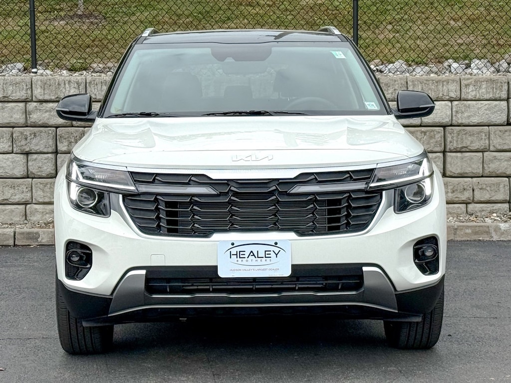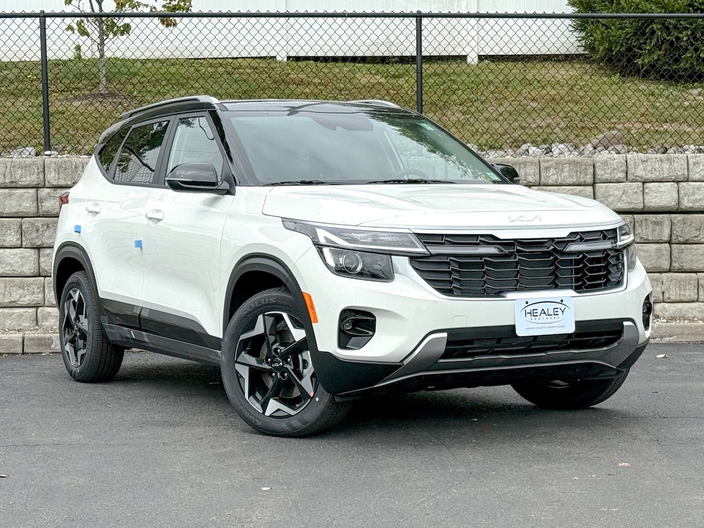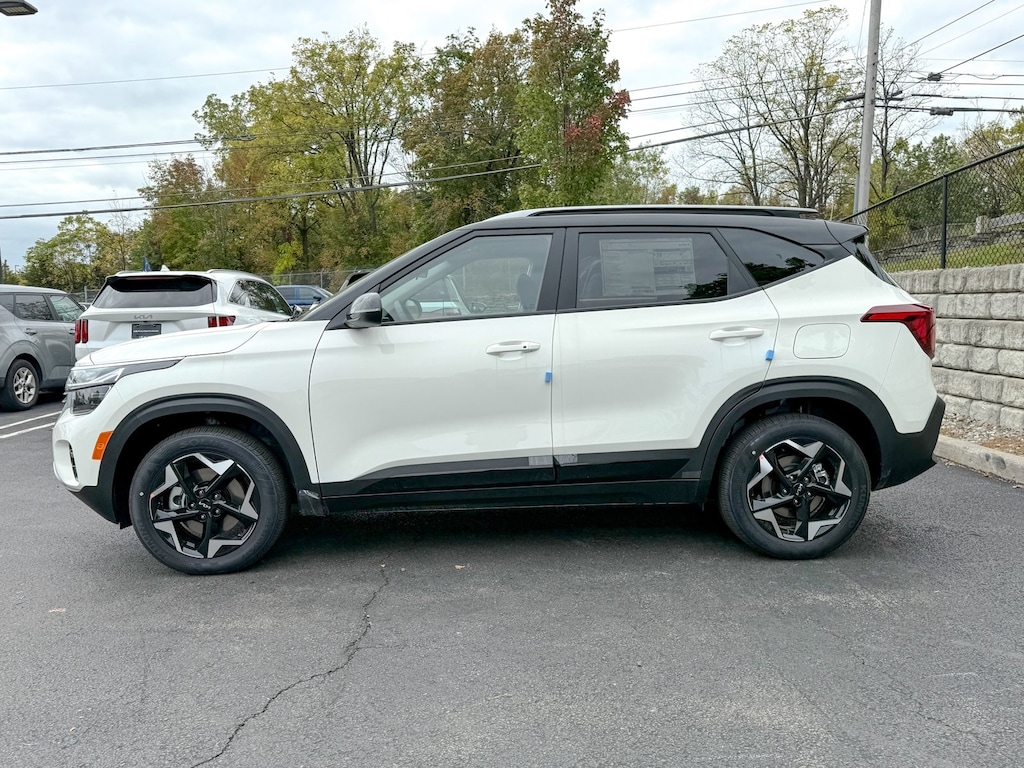 Clear White/Black Roof 2026 Kia Seltos S AWD CVT 2.0L I4 MPI 4-Wheel Disc Brakes, 6 Speakers, ABS brakes, Air Conditioning, Alloy wheels, AM/FM radio: SiriusXM, Apple CarPlay & Android Auto, Auto High-beam Headlights, Automatic temperature control, Brake assist, Bumpers: body-color, Carpet Floor Mats, Cloth & Artificial Leather Seat Trim, Delay-off headlights, Driver door bin, Driver vanity mirror, Dual front impact airbags, Dual front side impact airbags, Electronic Stability Control, Emergency communication system: 911 Connect, Exterior Parking Camera Rear, Four wheel independent suspension, Front anti-roll bar, Front Bucket Seats, Front Center Armrest, Front fog lights, Front reading lights, Fully automatic headlights, Glossy Black Door Garnish, Glossy Black Door Garnish Package, Heated door mirrors, Heated Front Bucket Seats (3-Steps), Heated front seats, Illuminated entry, Leather Shift Knob, Leather steering wheel, Low tire pressure warning, Navigation System, Occupant sensing airbag, Outside temperature display, Overhead airbag, Overhead console, Panic alarm, Passenger door bin, Passenger vanity mirror, Power door mirrors, Power steering, Power windows, Radio: AM/FM/HD/Satellite Display System w/Navigation, Rear seat center armrest, Rear window defroster, Rear window wiper, Remote keyless entry, Security system, Speed control, Speed-sensing steering, Split folding rear seat, Spoiler, Steering wheel mounted audio controls, Tachometer, Telescoping steering wheel, Tilt steering wheel, Traction control, Trip computer, Turn signal indicator mirrors, Variably intermittent wipers, Wheels: 17 Alloy w/Machined Finish.