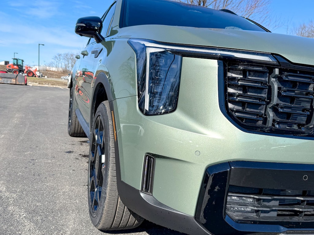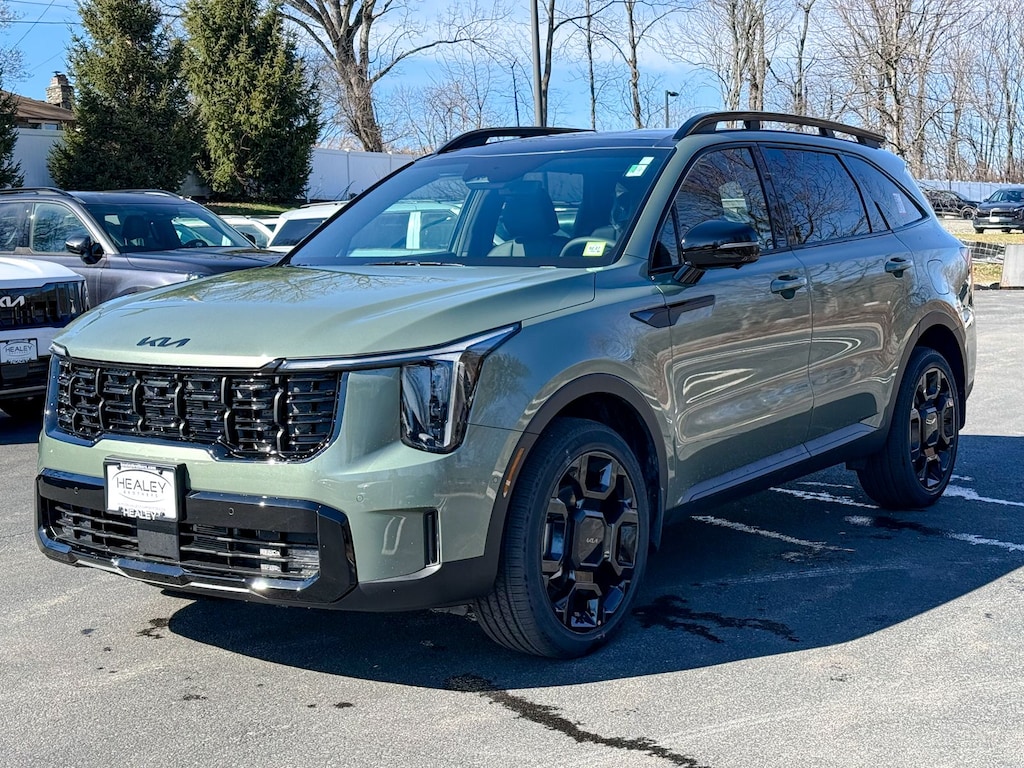 Jungle Green 2026 Kia Sorento X-Line SX Prestige AWD 8 Speed Dual Clutch 2.5L I4 DGI Turbocharged DOHC 16V LEV3-SULEV30 281hp 12 Speakers, 3rd row seats: split-bench, 4-Wheel Disc Brakes, ABS brakes, Air Conditioning, Alloy wheels, AM/FM radio: SiriusXM, Apple CarPlay & Android Auto, Auto High-beam Headlights, Auto-dimming Rear-View mirror, Automatic temperature control, Brake assist, Bumpers: body-color, Carpet Cargo Mat with Seatback Protection, Carpeted Floor Mats, Delay-off headlights, Driver door bin, Driver vanity mirror, Dual front impact airbags, Dual front side impact airbags, Electronic Stability Control, Emergency communication system: 911 Connect, Exterior Parking Camera Rear, Four wheel independent suspension, Front anti-roll bar, Front Bucket Seats, Front Center Armrest, Front dual zone A/C, Front fog lights, Front reading lights, Fully automatic headlights, Garage door transmitter: HomeLink, Heated and Ventilated Front Bucket Seats, Heated door mirrors, Heated front seats, Heated rear seats, Heated steering wheel, Illuminated entry, Knee airbag, Leather Shift Knob, Leather steering wheel, Low tire pressure warning, Memory seat, Navigation System, Occupant sensing airbag, Outside temperature display, Overhead airbag, Overhead console, Panic alarm, Passenger door bin, Passenger vanity mirror, Perforated Genuine Leather Seat Trim, Power door mirrors, Power driver seat, Power Liftgate, Power moonroof, Power passenger seat, Power steering, Power windows, Radio data system, Radio: AM/FM Bose Premium Audio System, Rain sensing wipers, Rear anti-roll bar, Rear reading lights, Rear side impact airbag, Rear window defroster, Rear window wiper, Remote keyless entry, Security system, Speed control, Speed-sensing steering, Split folding rear seat, Spoiler, Steering wheel mounted audio controls, Tachometer, Telescoping steering wheel, Tilt steering wheel, Traction control, Trip computer, Turn signal indicator mirrors, Variably intermittent wipers, Ventilated front seats, Wheels: 20" Gloss Black x-Line Alloy, X-Line Mudguards.