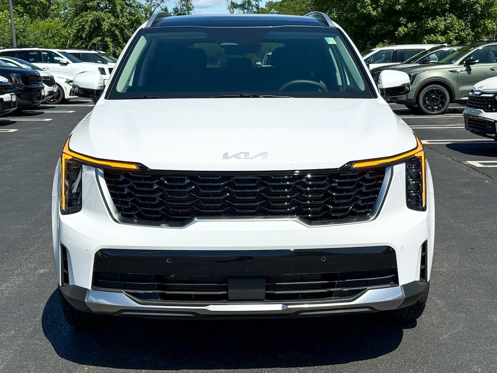 Glacial White Pearl 2026 Kia Sorento S AWD 8-Speed Automatic 2.5L I4 DGI DOHC 16V LEV3-SULEV30 191hp 3rd row seats: split-bench, 4-Wheel Disc Brakes, 6 Speakers, ABS brakes, Air Conditioning, Alloy wheels, AM/FM radio: SiriusXM, Apple CarPlay & Android Auto, Auto High-beam Headlights, Automatic temperature control, Brake assist, Bumpers: body-color, Carpeted Floor Mats, Delay-off headlights, Driver door bin, Driver vanity mirror, Dual front impact airbags, Dual front side impact airbags, Electronic Stability Control, Emergency communication system: 911 Connect, Exterior Parking Camera Rear, Four wheel independent suspension, Front anti-roll bar, Front Bucket Seats, Front Center Armrest, Front dual zone A/C, Front reading lights, Full-Length One-Touch Panoroof w/Sliding Sunshade, Fully automatic headlights, Heated door mirrors, Heated Front Bucket Seats, Heated front seats, Illuminated entry, Knee airbag, Leather Shift Knob, Leather steering wheel, LED Interior Lighting, Low tire pressure warning, Occupant sensing airbag, Outside temperature display, Overhead airbag, Overhead console, Panic alarm, Passenger door bin, Passenger vanity mirror, Power door mirrors, Power driver seat, Power steering, Power windows, Radio data system, Radio: AM/FM Standard Sound System, Rear anti-roll bar, Rear reading lights, Rear seat center armrest, Rear side impact airbag, Rear window defroster, Rear window wiper, Remote keyless entry, S Panoramic Sunroof Package, Security system, Speed control, Speed-sensing steering, Split folding rear seat, Spoiler, Steering wheel mounted audio controls, SynTex Artificial Leather Seat Trim, Tachometer, Telescoping steering wheel, Tilt steering wheel, Traction control, Trip computer, Turn signal indicator mirrors, Variably intermittent wipers, Wheels: 18 Gloss Black Alloy.