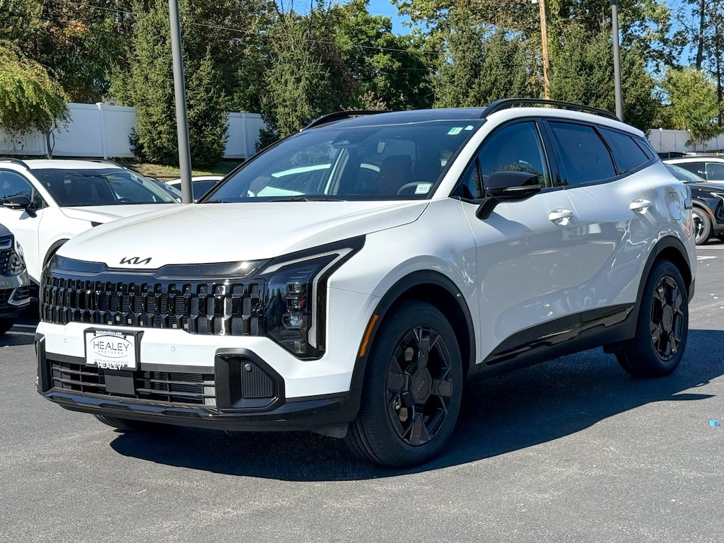 Glacial White Pearl 2026 Kia Sportage X-Line AWD 8-Speed Automatic I4 4-Wheel Disc Brakes, 6 Speakers, ABS brakes, Air Conditioning, Alloy wheels, Auto High-beam Headlights, Automatic temperature control, Brake assist, Bumpers: body-color, Cargo Net w/o Audio, Carpeted Floor Mats, Delay-off headlights, Driver door bin, Driver vanity mirror, Dual front impact airbags, Dual front side impact airbags, Electronic Stability Control, Emergency communication system: Kia Connect (includes 1 year free trial), Four wheel independent suspension, Front anti-roll bar, Front Bucket Seats, Front Center Armrest, Front dual zone A/C, Fully automatic headlights, Heated door mirrors, Heated Front Bucket Seats, Heated front seats, Illuminated entry, Leather steering wheel, LED Interior Lighting, Low tire pressure warning, Occupant sensing airbag, Outside temperature display, Overhead airbag, Overhead console, Panic alarm, Panoramic Sunroof, Passenger door bin, Passenger vanity mirror, Power door mirrors, Power driver seat, Power steering, Power windows, Radio: AM/FM/HD Audio System, Rain sensing wipers, Rear anti-roll bar, Rear seat center armrest, Rear side impact airbag, Rear window defroster, Rear window wiper, Remote keyless entry, Security system, Smart Power Liftgate, Speed control, Speed-sensing steering, Split folding rear seat, Spoiler, Steering wheel mounted audio controls, SynTex Premium Leatherette Seat Trim, Tachometer, Telescoping steering wheel, Tilt steering wheel, Traction control, Trip computer, Turn signal indicator mirrors, Variably intermittent wipers, Wheels: 19 x 7.5J Gloss Black Alloy, X-Line Premium Package.