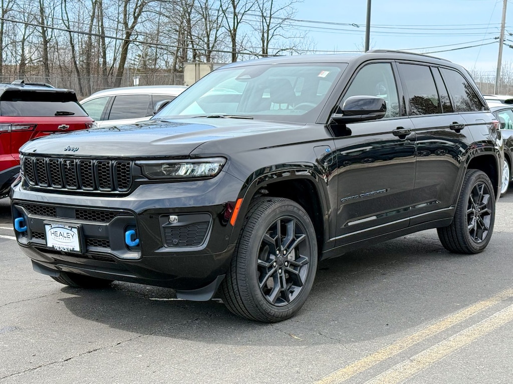 Diamond Black Crystal Pearlcoat 2023 Jeep Grand Cherokee 4xe 2.0L I4 DOHC 8-Speed Automatic 4WD 10 Speakers, 2 Front Tow Hooks, 2nd-Row Manual Window Shades, 3.70 Rear Axle Ratio, 30th Anniversary Edition, 30th Anniversary Package Badge, 4-Wheel Disc Brakes, ABS brakes, Air Conditioning, Alloy wheels, AM/FM radio: SiriusXM with 360L, Anti-whiplash front head restraints, Audio memory, Auto High-beam Headlights, Auto-Dimming Exterior Driver Mirror, Automatic temperature control, Blue Tow Hooks, Brake assist, Bumpers: body-color, Capri Leatherette Seats, Capri Leatherette w/Axis II Seats, Compass, Delay-off headlights, Driver door bin, Driver vanity mirror, Dual Bright Exhaust Tips, Dual front impact airbags, Dual front side impact airbags, Electronic Stability Control, Four wheel independent suspension, Front anti-roll bar, Front Bucket Seats, Front Center Armrest w/Storage, Front dual zone A/C, Front Fascia Upper B, Front fog lights, Front License Plate Bracket, Front reading lights, Fully automatic headlights, Garage door transmitter, Gloss Black Exterior Accents, Heated door mirrors, Heated front seats, Heated rear seats, Heated steering wheel, Heavy Duty Suspension, Illuminated entry, Integrated Off-Road Camera, Intersection Collision Assist System, Knee airbag, Low tire pressure warning, Memory seat, Memory Steering Column, Molded In Color Black/Gloss Black Roof Rails, Navigation System, Occupant sensing airbag, Outside temperature display, Overhead airbag, Overhead console, Painted Door Cladding, Painted Lower Front Fascia, Painted Lower Rear Fascia, Painted Lower Rocker Panel Cladding, Painted Wheel Flares, Panic alarm, ParkSense Front/Rear Park Assist w/Stop, ParkView Rear Back-Up Camera, Passenger door bin, Passenger vanity mirror, Passive Entry - Front/Rear Doors, Liftgate, Power door mirrors, Power driver seat, Power Liftgate, Power moonroof, Power passenger seat, Power steering, Power Tilt/Telescope Steering Column, Power windows, Quick Order Package 27H 30th Anniversary, Radio data system, Radio: Uconnect 5 Nav w/10.1" Display, Rain Sensitive Windshield Wipers, Rear anti-roll bar, Rear Back Up Camera Washer, Rear reading lights, Rear window defroster, Rear window wiper, Rearview Autodim Digital Display Mirror, Remote keyless entry, Security system, Speed control, Speed-Sensitive Wipers, Split folding rear seat, Spoiler, Steering wheel mounted audio controls, Surround View Camera System, Tachometer, Telescoping steering wheel, Tilt steering wheel, Traction control, Trip computer, Turn signal indicator mirrors, Variably intermittent wipers, Ventilated Front Seats, Voltmeter, Wheels: 18" x 8" Fully Painted Aluminum, Wheels: 20" x 8.5" Black Painted Aluminum, Wireless Charging Pad.