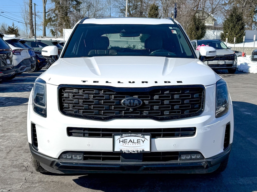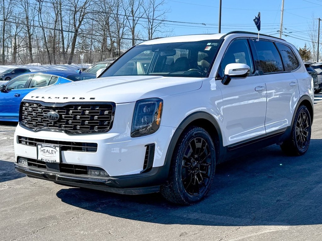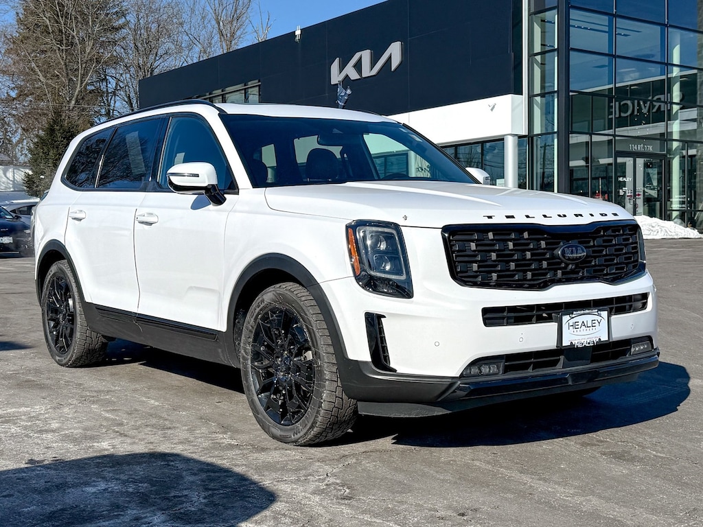 Glacial White Pearl 2021 Kia Telluride SX 3.8L V6 DGI DOHC Dual CVVT 8-Speed Automatic AWD 10 Speakers, 110V Inverter, 3.648 Axle Ratio, 3rd row seats: split-bench, 4-Wheel Disc Brakes, ABS brakes, Air Conditioning, Alloy wheels, AM/FM radio: SiriusXM, Apple CarPlay & Android Auto, Auto High-beam Headlights, Auto-dimming Rear-View mirror, Automatic temperature control, Black Finish Radiator Grille, Body Color Exterior Door Handles, Brake assist, Bumpers: body-color, Cargo Net, Carpeted Floor Mats, Compass, Delay-off headlights, Driver door bin, Driver vanity mirror, Dual front impact airbags, Dual front side impact airbags, Electronic Stability Control, Emergency communication system: 911 Connect, Exclusive Black Fog Light Bezel, Exclusive Black Headlight Bezels, Four wheel independent suspension, Front & Rear Gloss Black Finish Bumper Skid Plates, Front & Rear KIA Logo, Front anti-roll bar, Front Bucket Seats, Front Center Armrest, Front dual zone A/C, Front fog lights, Front reading lights, Fully automatic headlights, Garage door transmitter: HomeLink, Gloss Black Finish Exterior Emblems, Gloss Black Finish Front & Rear Door Garnish, Gloss Black Finish Roof Rails, Heads-Up Display, Heated & Ventilated 2nd Row Seats, Heated & Ventilated Front Bucket Seats, Heated door mirrors, Heated front seats, Heated steering wheel, Illuminated entry, Knee airbag, Leather Seat Trim, Leather Shift Knob, Leather steering wheel, Low tire pressure warning, Memory seat, Navigation System, Nightfall Edition Package, Occupant sensing airbag, Outside temperature display, Overhead airbag, Overhead console, Panic alarm, Passenger door bin, Passenger vanity mirror, Power door mirrors, Power driver seat, Power Liftgate, Power moonroof, Power passenger seat, Power steering, Power windows, Premium Cloth Headliner & Pillar Trim, Premium Nappa Leather Seat Trim, Radio data system, Radio: AM/FM/SIRIUS Premium Audio, Rain-Sensing Front Windshield Wipers, Rear air conditioning, Rear anti-roll bar, Rear audio controls, Rear reading lights, Rear window defroster, Rear window wiper, Reclining 3rd row seat, Remote keyless entry, Roof rack: rails only, Security system, Self Leveling Rear Suspension, Smart Key w/ Push Button and Remote Start, Speed control, Speed-sensing steering, Split folding rear seat, Spoiler, Steering wheel mounted audio controls, SX Dune Brown Nappa Leather Seats, SX Prestige Package, Tachometer, Telescoping steering wheel, Tilt steering wheel, Tow Hitch w/Harness (TOF), Towing Package, Traction control, Trip computer, Turn signal indicator mirrors, Variably intermittent wipers, Ventilated front seats, Wheels: 7.5" x 20" Black Finish Alloy, Wheels: 7.5" x 20" Exclusive Black Finish Alloy.